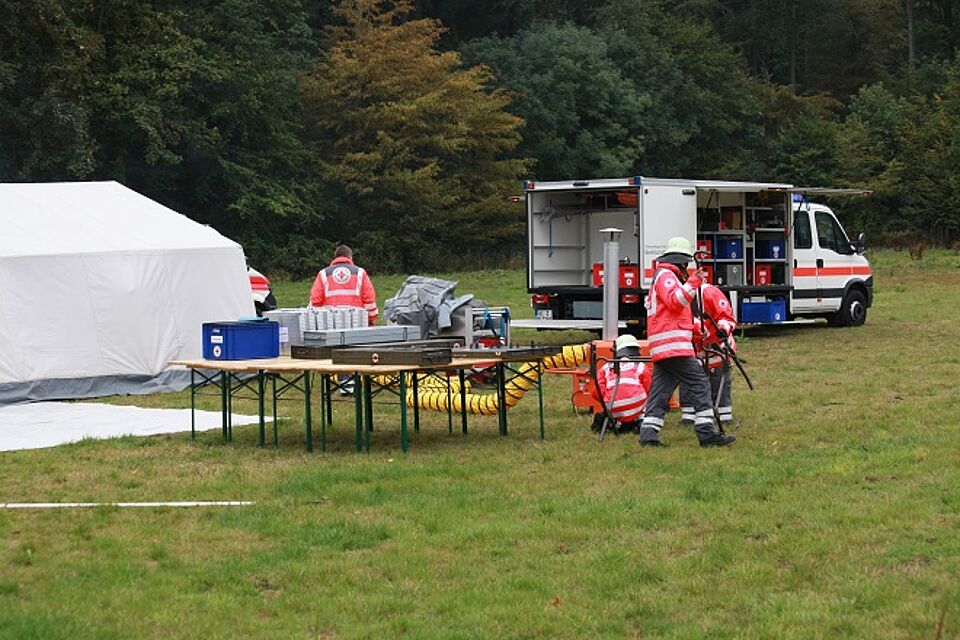 Nur 15 Minuten später beginnt die zweite Alarmübung für den DRK Einsatzzug. Nach mehreren Unfällen im Bereich der Gemeinde Schellerten ist der erweiterte Rettungsdienst im Einsatz. Der DRK Einsatzzug soll für die ca. 20 verletzten Personen einen Behandlungsplatz auf dem Sportplatz in Wöhle einrichten.