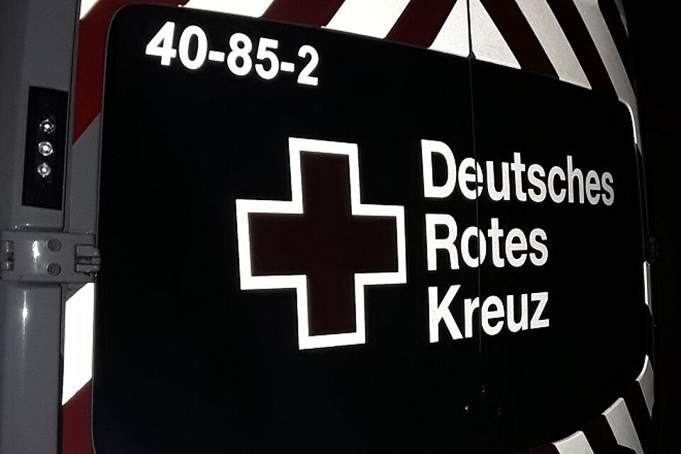 Frontal wurde das klassische leuchtrote Foliendesign reduziert. Die Motorhaube bleibt mittig weiß und erhält neben dem DRK-Schriftzug im unteren Bereich eine waagerechte leuchtgelbe und an den Seiten leuchtrote Folienmarkierungen.