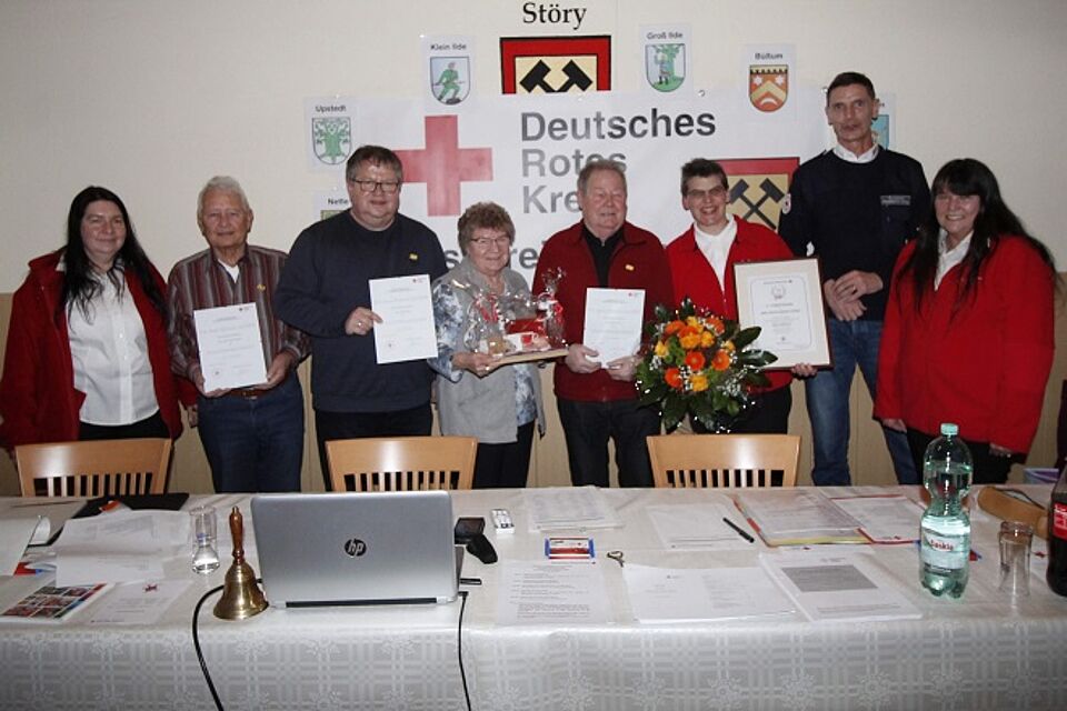 Die Jubilare wurden während der Versammlung mit einer Urkunde aus den Händen des Präsidenten des DRK-Kreisverbandes Landrat Olaf Levonen sowie einem Präsent bedacht. Aus gesundheitlichen Gründen konnte Heinrich Wintel, selbst langjähriger Vorsitzender des DRK Störy und Ortsvorsteher in Störy nicht an der Versammlung teilnehmen. Um ihm jedoch für seine 60jährige Rotkreuzzugehörigkeit zu danken und diese besonders zu ehren, begab sich der geschäftsführende Vorstand gemeinsam mit Landrat Olaf Levonen persönlich zu Heinrich Wintel nach Hause. Kurz vor Versammlungsbeginn bekam er so seine besondere Auszeichnung in Form einer vom Landesverband unterzeichneten Urkunde und einem Präsent.